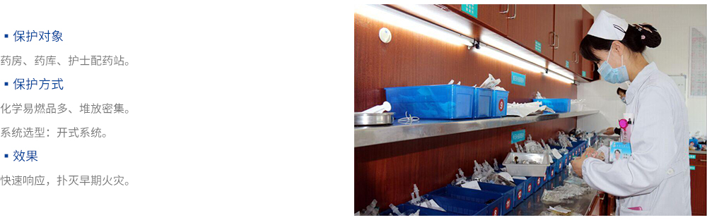 为医院、医疗中心、制药车间、医药仓库等场所设计,在保障人员安全的前提下,快速、高效灭火,最大限度减少财产损失和业务中断。